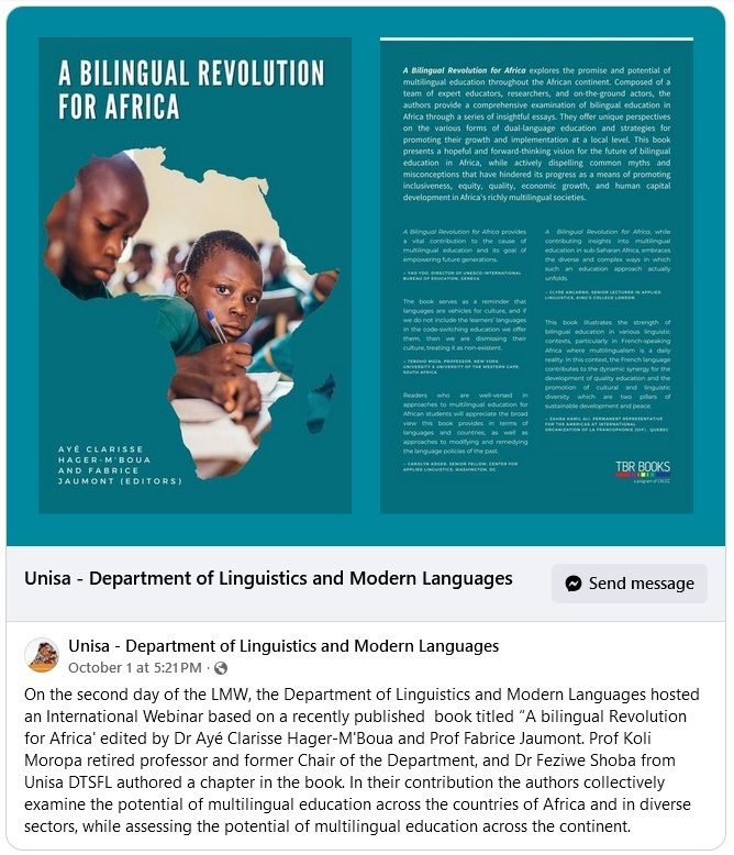 Thank you so much to the Department of Linguistics and Modern Languages at University of South Africa/Universiteit van Suid-Afrika (UNISA) for hosting the “A Bilingual Revolution for Africa” webinar. It was a great honor to be the keynote speaker and share insights alongside distinguished colleagues, including Prof. Sis Koli Moropa, who introduced me so graciously. The program highlighted key topics, from Dr. Maria J. Aaron’s presentation on improving education quality using African languages to Prof. Pierre De Galbert and Dr. Cornelius Wambi, Gulere’s exploration of multilingual teachers in multilingual classrooms. Djeneba Deby Bagayoko’s powerful talk on decolonial multilingual education through African mother tongues underscored the urgency of this dialogue.